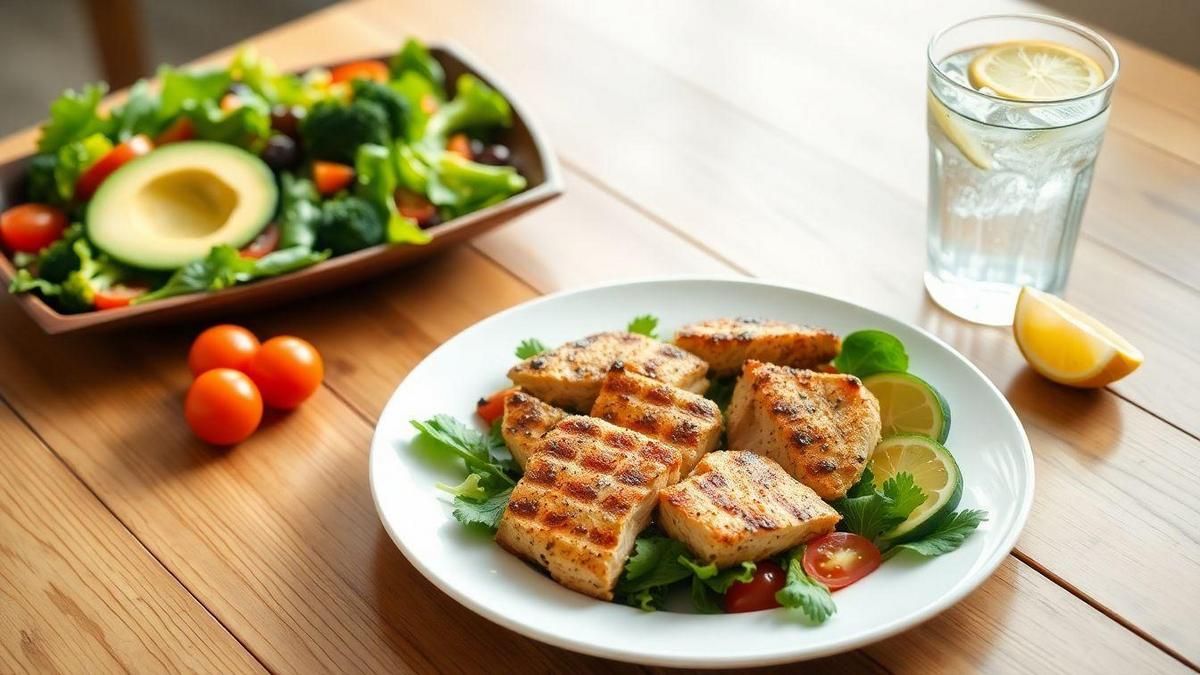 - Salada de Frango com Abacate: Misture frango grelhado, abacate, alface e um fio de azeite.